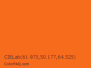 CIELab 61.975,50.177,64.525 Color is a normal orange color and the nearest color is Orange #ff681f. Hex code #f76b1c and RGB value is rgb(247,107,28). In RGB color space, this color is composed of 97% red, 42% green, 11% blue, In CMYK color space, this color is composed of 0% cyan, 57% magenta, 89% yellow , 3% black , In HSL color space, this color has a hue angle of 22° , 93% saturation and 54% lightness.