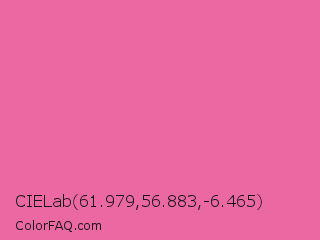 CIELab 61.979,56.883,-6.465 Color is a light rose color and the nearest color is Cyclamen #f56fa1. Hex code #ec68a3 and RGB value is rgb(236,104,163). In RGB color space, this color is composed of 93% red, 41% green, 64% blue, In CMYK color space, this color is composed of 0% cyan, 56% magenta, 31% yellow , 7% black , In HSL color space, this color has a hue angle of 333° , 78% saturation and 67% lightness.