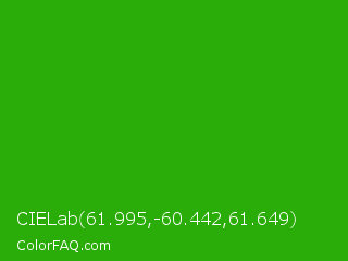 CIELab 61.995,-60.442,61.649 Color is a normal green color and the nearest color is Slimy Green #299617. Hex code #2aad08 and RGB value is rgb(42,173,8). In RGB color space, this color is composed of 16% red, 68% green, 3% blue, In CMYK color space, this color is composed of 76% cyan, 0% magenta, 95% yellow , 32% black , In HSL color space, this color has a hue angle of 108° , 91% saturation and 35% lightness.
