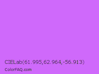 CIELab 61.995,62.964,-56.913 Color is a light purple color and the nearest color is Heliotrope #df73ff. Hex code #cf69fc and RGB value is rgb(207,105,252). In RGB color space, this color is composed of 81% red, 41% green, 99% blue, In CMYK color space, this color is composed of 18% cyan, 58% magenta, 0% yellow , 1% black , In HSL color space, this color has a hue angle of 282° , 96% saturation and 70% lightness.