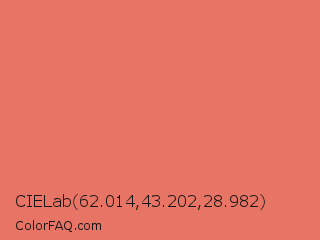 CIELab 62.014,43.202,28.982 Color is a light red color and the nearest color is Terracotta #e2725b. Hex code #e77465 and RGB value is rgb(231,116,101). In RGB color space, this color is composed of 91% red, 45% green, 40% blue, In CMYK color space, this color is composed of 0% cyan, 50% magenta, 56% yellow , 9% black , In HSL color space, this color has a hue angle of 7° , 73% saturation and 65% lightness.