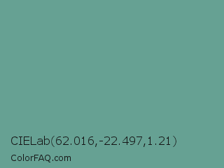 CIELab 62.016,-22.497,1.21 Color is a normal cyan color and the nearest color is Patina #639a8f. Hex code #66a193 and RGB value is rgb(102,161,147). In RGB color space, this color is composed of 40% red, 63% green, 58% blue, In CMYK color space, this color is composed of 37% cyan, 0% magenta, 9% yellow , 37% black , In HSL color space, this color has a hue angle of 166° , 24% saturation and 52% lightness.