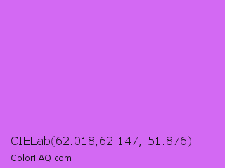 CIELab 62.018,62.147,-51.876 Color is a light purple color and the nearest color is Heliotrope #df73ff. Hex code #d369f3 and RGB value is rgb(211,105,243). In RGB color space, this color is composed of 83% red, 41% green, 95% blue, In CMYK color space, this color is composed of 13% cyan, 57% magenta, 0% yellow , 5% black , In HSL color space, this color has a hue angle of 286° , 85% saturation and 68% lightness.