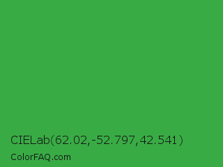 CIELab 62.02,-52.797,42.541 Color is a normal green color and the nearest color is Wageningen Green #34b233. Hex code #39ab45 and RGB value is rgb(57,171,69). In RGB color space, this color is composed of 22% red, 67% green, 27% blue, In CMYK color space, this color is composed of 67% cyan, 0% magenta, 60% yellow , 33% black , In HSL color space, this color has a hue angle of 126° , 50% saturation and 45% lightness.