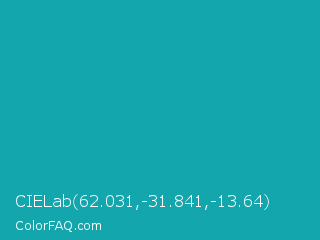 CIELab 62.031,-31.841,-13.64 Color is a normal cyan color and the nearest color is Eastern Blue #1e9ab0. Hex code #14a6ad and RGB value is rgb(20,166,173). In RGB color space, this color is composed of 8% red, 65% green, 68% blue, In CMYK color space, this color is composed of 88% cyan, 4% magenta, 0% yellow , 32% black , In HSL color space, this color has a hue angle of 183° , 79% saturation and 38% lightness.