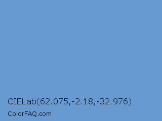 CIELab 62.075,-2.18,-32.976 Color is a light blue color and the nearest color is Blue Gray #6699cc. Hex code #669ad0 and RGB value is rgb(102,154,208). In RGB color space, this color is composed of 40% red, 60% green, 82% blue, In CMYK color space, this color is composed of 51% cyan, 26% magenta, 0% yellow , 18% black , In HSL color space, this color has a hue angle of 211° , 53% saturation and 61% lightness.