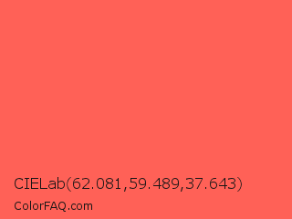 CIELab 62.081,59.489,37.643 Color is a light red color and the nearest color is Sunset Orange #fd5e53. Hex code #ff6157 and RGB value is rgb(255,97,87). In RGB color space, this color is composed of 100% red, 38% green, 34% blue, In CMYK color space, this color is composed of 0% cyan, 62% magenta, 66% yellow , 0% black , In HSL color space, this color has a hue angle of 4° , 100% saturation and 67% lightness.