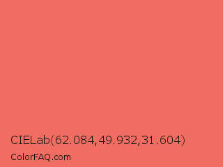 CIELab 62.084,49.932,31.604 Color is a light red color and the nearest color is Bittersweet #fe6f5e. Hex code #f16d61 and RGB value is rgb(241,109,97). In RGB color space, this color is composed of 95% red, 43% green, 38% blue, In CMYK color space, this color is composed of 0% cyan, 55% magenta, 60% yellow , 5% black , In HSL color space, this color has a hue angle of 5° , 84% saturation and 66% lightness.