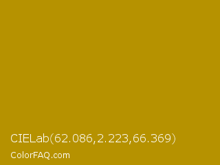 CIELab 62.086,2.223,66.369 Color is a normal yellow color and the nearest color is Dark Goldenrod #b8860b. Hex code #b69200 and RGB value is rgb(182,146,0). In RGB color space, this color is composed of 71% red, 57% green, 0% blue, In CMYK color space, this color is composed of 0% cyan, 20% magenta, 100% yellow , 29% black , In HSL color space, this color has a hue angle of 48° , 100% saturation and 36% lightness.