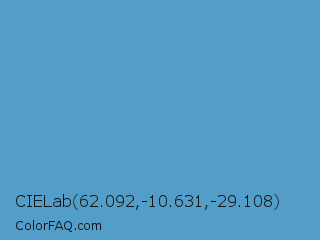 CIELab 62.092,-10.631,-29.108 Color is a normal blue color and the nearest color is Carolina Blue #56a0d3. Hex code #539ec9 and RGB value is rgb(83,158,201). In RGB color space, this color is composed of 33% red, 62% green, 79% blue, In CMYK color space, this color is composed of 59% cyan, 21% magenta, 0% yellow , 21% black , In HSL color space, this color has a hue angle of 202° , 52% saturation and 56% lightness.