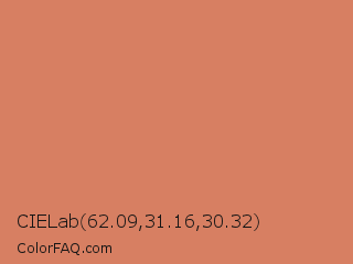 CIELab 62.09,31.16,30.32 Color is a light color and the nearest color is Japonica #d87c63. Hex code #d77f62 and RGB value is rgb(215,127,98). In RGB color space, this color is composed of 84% red, 50% green, 38% blue, In CMYK color space, this color is composed of 0% cyan, 41% magenta, 54% yellow , 16% black , In HSL color space, this color has a hue angle of 15° , 59% saturation and 61% lightness.