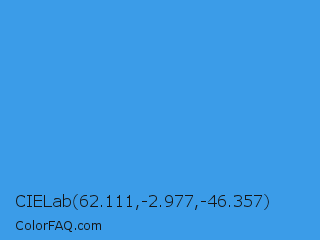 CIELab 62.111,-2.977,-46.357 Color is a normal blue color and the nearest color is Tufts Blue #3e8ede. Hex code #3b9ce8 and RGB value is rgb(59,156,232). In RGB color space, this color is composed of 23% red, 61% green, 91% blue, In CMYK color space, this color is composed of 75% cyan, 33% magenta, 0% yellow , 9% black , In HSL color space, this color has a hue angle of 206° , 79% saturation and 57% lightness.