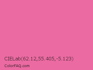 CIELab 62.12,55.405,-5.123 Color is a light rose color and the nearest color is Cyclamen #f56fa1. Hex code #eb6aa1 and RGB value is rgb(235,106,161). In RGB color space, this color is composed of 92% red, 42% green, 63% blue, In CMYK color space, this color is composed of 0% cyan, 55% magenta, 31% yellow , 8% black , In HSL color space, this color has a hue angle of 334° , 76% saturation and 67% lightness.