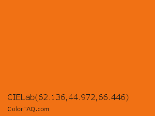 CIELab 62.136,44.972,66.446 Color is a normal orange color and the nearest color is Ecstasy #fa7814. Hex code #f17114 and RGB value is rgb(241,113,20). In RGB color space, this color is composed of 95% red, 44% green, 8% blue, In CMYK color space, this color is composed of 0% cyan, 53% magenta, 92% yellow , 5% black , In HSL color space, this color has a hue angle of 25° , 89% saturation and 51% lightness.