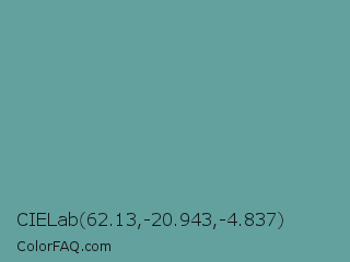 CIELab 62.13,-20.943,-4.837 Color is a normal cyan color and the nearest color is Cadet Blue #5f9ea0. Hex code #62a19e and RGB value is rgb(98,161,158). In RGB color space, this color is composed of 38% red, 63% green, 62% blue, In CMYK color space, this color is composed of 39% cyan, 0% magenta, 2% yellow , 37% black , In HSL color space, this color has a hue angle of 177° , 25% saturation and 51% lightness.