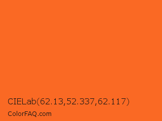CIELab 62.13,52.337,62.117 Color is a normal orange color and the nearest color is Orange #ff681f. Hex code #fa6924 and RGB value is rgb(250,105,36). In RGB color space, this color is composed of 98% red, 41% green, 14% blue, In CMYK color space, this color is composed of 0% cyan, 58% magenta, 86% yellow , 2% black , In HSL color space, this color has a hue angle of 19° , 96% saturation and 56% lightness.