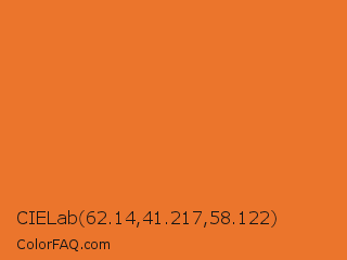 CIELab 62.14,41.217,58.122 Color is a normal orange color and the nearest color is Vivid Tangelo #f07427. Hex code #eb752c and RGB value is rgb(235,117,44). In RGB color space, this color is composed of 92% red, 46% green, 17% blue, In CMYK color space, this color is composed of 0% cyan, 50% magenta, 81% yellow , 8% black , In HSL color space, this color has a hue angle of 23° , 83% saturation and 55% lightness.