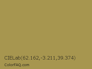 CIELab 62.162,-3.211,39.374 Color is a normal yellow color and the nearest color is Limed Oak #ac8a56. Hex code #a7964f and RGB value is rgb(167,150,79). In RGB color space, this color is composed of 65% red, 59% green, 31% blue, In CMYK color space, this color is composed of 0% cyan, 10% magenta, 53% yellow , 35% black , In HSL color space, this color has a hue angle of 48° , 36% saturation and 48% lightness.