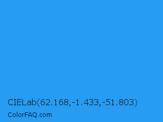 CIELab 62.168,-1.433,-51.803 Color is a normal blue color and the nearest color is Button Blue #24a0ed. Hex code #269cf2 and RGB value is rgb(38,156,242). In RGB color space, this color is composed of 15% red, 61% green, 95% blue, In CMYK color space, this color is composed of 84% cyan, 36% magenta, 0% yellow , 5% black , In HSL color space, this color has a hue angle of 205° , 89% saturation and 55% lightness.