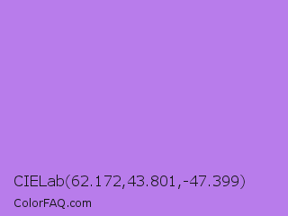 CIELab 62.172,43.801,-47.399 Color is a light purple color and the nearest color is Lavender #b57edc. Hex code #b87ceb and RGB value is rgb(184,124,235). In RGB color space, this color is composed of 72% red, 49% green, 92% blue, In CMYK color space, this color is composed of 22% cyan, 47% magenta, 0% yellow , 8% black , In HSL color space, this color has a hue angle of 272° , 74% saturation and 70% lightness.