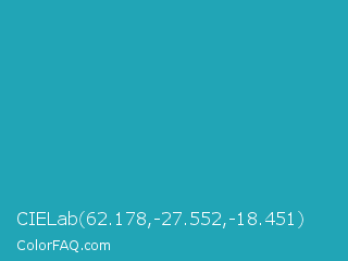 CIELab 62.178,-27.552,-18.451 Color is a normal cyan color and the nearest color is Eastern Blue #1e9ab0. Hex code #21a5b6 and RGB value is rgb(33,165,182). In RGB color space, this color is composed of 13% red, 65% green, 71% blue, In CMYK color space, this color is composed of 82% cyan, 9% magenta, 0% yellow , 29% black , In HSL color space, this color has a hue angle of 187° , 69% saturation and 42% lightness.