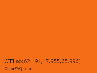CIELab 62.191,47.955,65.996 Color is a normal orange color and the nearest color is Ecstasy #fa7814. Hex code #f56e17 and RGB value is rgb(245,110,23). In RGB color space, this color is composed of 96% red, 43% green, 9% blue, In CMYK color space, this color is composed of 0% cyan, 55% magenta, 91% yellow , 4% black , In HSL color space, this color has a hue angle of 24° , 92% saturation and 53% lightness.