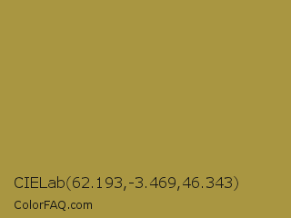 CIELab 62.193,-3.469,46.343 Color is a normal yellow color and the nearest color is Brass #b5a642. Hex code #a99641 and RGB value is rgb(169,150,65). In RGB color space, this color is composed of 66% red, 59% green, 25% blue, In CMYK color space, this color is composed of 0% cyan, 11% magenta, 62% yellow , 34% black , In HSL color space, this color has a hue angle of 49° , 44% saturation and 46% lightness.