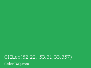 CIELab 62.22,-53.31,33.357 Color is a normal green color and the nearest color is Chateau Green #40a860. Hex code #28ac58 and RGB value is rgb(40,172,88). In RGB color space, this color is composed of 16% red, 67% green, 35% blue, In CMYK color space, this color is composed of 77% cyan, 0% magenta, 49% yellow , 33% black , In HSL color space, this color has a hue angle of 142° , 62% saturation and 42% lightness.