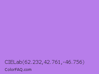 CIELab 62.232,42.761,-46.756 Color is a light purple color and the nearest color is Lavender #b57edc. Hex code #b77dea and RGB value is rgb(183,125,234). In RGB color space, this color is composed of 72% red, 49% green, 92% blue, In CMYK color space, this color is composed of 22% cyan, 47% magenta, 0% yellow , 8% black , In HSL color space, this color has a hue angle of 272° , 72% saturation and 70% lightness.