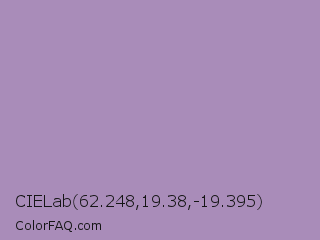 CIELab 62.248,19.38,-19.395 Color is a light purple color and the nearest color is Glossy Grape #ab92b3. Hex code #a98cb9 and RGB value is rgb(169,140,185). In RGB color space, this color is composed of 66% red, 55% green, 73% blue, In CMYK color space, this color is composed of 9% cyan, 24% magenta, 0% yellow , 27% black , In HSL color space, this color has a hue angle of 279° , 24% saturation and 64% lightness.