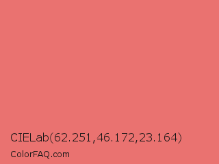 CIELab 62.251,46.172,23.164 Color is a light red color and the nearest color is Candy Pink #e4717a. Hex code #ea7270 and RGB value is rgb(234,114,112). In RGB color space, this color is composed of 92% red, 45% green, 44% blue, In CMYK color space, this color is composed of 0% cyan, 51% magenta, 52% yellow , 8% black , In HSL color space, this color has a hue angle of 1° , 74% saturation and 68% lightness.