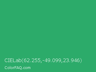 CIELab 62.255,-49.099,23.946 Color is a normal green color and the nearest color is Medium Sea Green #3cb371. Hex code #2cab6a and RGB value is rgb(44,171,106). In RGB color space, this color is composed of 17% red, 67% green, 42% blue, In CMYK color space, this color is composed of 74% cyan, 0% magenta, 38% yellow , 33% black , In HSL color space, this color has a hue angle of 149° , 59% saturation and 42% lightness.