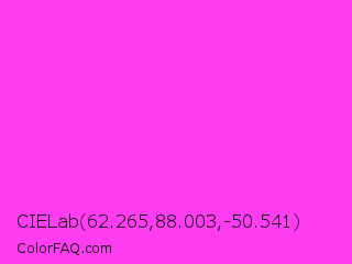 CIELab 62.265,88.003,-50.541 Color is a light magenta color and the nearest color is Purple Pizzazz #fe4eda. Hex code #fe3cf2 and RGB value is rgb(254,60,242). In RGB color space, this color is composed of 100% red, 24% green, 95% blue, In CMYK color space, this color is composed of 0% cyan, 76% magenta, 5% yellow , 0% black , In HSL color space, this color has a hue angle of 304° , 99% saturation and 62% lightness.