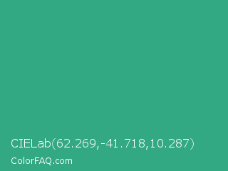 CIELab 62.269,-41.718,10.287 Color is a normal green color and the nearest color is Jungle Green #29ab87. Hex code #33a983 and RGB value is rgb(51,169,131). In RGB color space, this color is composed of 20% red, 66% green, 51% blue, In CMYK color space, this color is composed of 70% cyan, 0% magenta, 22% yellow , 34% black , In HSL color space, this color has a hue angle of 161° , 54% saturation and 43% lightness.