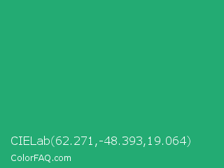 CIELab 62.271,-48.393,19.064 Color is a normal green color and the nearest color is Green Crayola #1cac78. Hex code #23ab73 and RGB value is rgb(35,171,115). In RGB color space, this color is composed of 14% red, 67% green, 45% blue, In CMYK color space, this color is composed of 80% cyan, 0% magenta, 33% yellow , 33% black , In HSL color space, this color has a hue angle of 155° , 66% saturation and 40% lightness.
