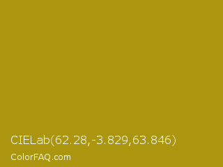 CIELab 62.28,-3.829,63.846 Color is a normal yellow color and the nearest color is Lucky #af9f1c. Hex code #ad960f and RGB value is rgb(173,150,15). In RGB color space, this color is composed of 68% red, 59% green, 6% blue, In CMYK color space, this color is composed of 0% cyan, 13% magenta, 91% yellow , 32% black , In HSL color space, this color has a hue angle of 51° , 84% saturation and 37% lightness.