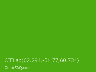 CIELab 62.294,-51.77,60.734 Color is a normal green color and the nearest color is Kelly Green #4cbb17. Hex code #4dab12 and RGB value is rgb(77,171,18). In RGB color space, this color is composed of 30% red, 67% green, 7% blue, In CMYK color space, this color is composed of 55% cyan, 0% magenta, 89% yellow , 33% black , In HSL color space, this color has a hue angle of 97° , 81% saturation and 37% lightness.
