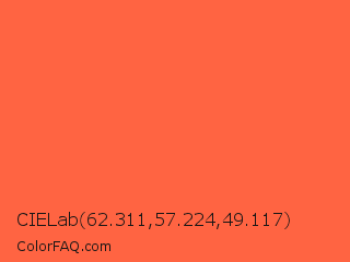 CIELab 62.311,57.224,49.117 Color is a light red color and the nearest color is Tomato #ff6347. Hex code #ff6442 and RGB value is rgb(255,100,66). In RGB color space, this color is composed of 100% red, 39% green, 26% blue, In CMYK color space, this color is composed of 0% cyan, 61% magenta, 74% yellow , 0% black , In HSL color space, this color has a hue angle of 11° , 100% saturation and 63% lightness.