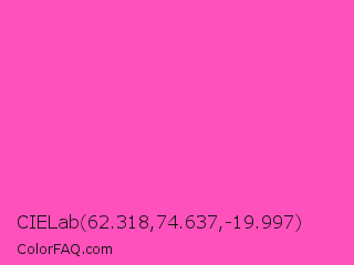 CIELab 62.318,74.637,-19.997 Color is a light magenta color and the nearest color is Light Deep Pink #ff5ccd. Hex code #ff51bc and RGB value is rgb(255,81,188). In RGB color space, this color is composed of 100% red, 32% green, 74% blue, In CMYK color space, this color is composed of 0% cyan, 68% magenta, 26% yellow , 0% black , In HSL color space, this color has a hue angle of 323° , 100% saturation and 66% lightness.
