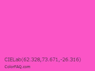 CIELab 62.328,73.671,-26.316 Color is a light magenta color and the nearest color is Light Deep Pink #ff5ccd. Hex code #fa54c7 and RGB value is rgb(250,84,199). In RGB color space, this color is composed of 98% red, 33% green, 78% blue, In CMYK color space, this color is composed of 0% cyan, 66% magenta, 20% yellow , 2% black , In HSL color space, this color has a hue angle of 318° , 94% saturation and 65% lightness.
