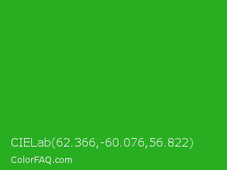 CIELab 62.366,-60.076,56.822 Color is a normal green color and the nearest color is Wageningen Green #34b233. Hex code #28ae21 and RGB value is rgb(40,174,33). In RGB color space, this color is composed of 16% red, 68% green, 13% blue, In CMYK color space, this color is composed of 77% cyan, 0% magenta, 81% yellow , 32% black , In HSL color space, this color has a hue angle of 117° , 68% saturation and 41% lightness.