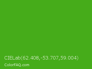CIELab 62.408,-53.707,59.004 Color is a normal green color and the nearest color is Kelly Green #4cbb17. Hex code #46ac1a and RGB value is rgb(70,172,26). In RGB color space, this color is composed of 27% red, 67% green, 10% blue, In CMYK color space, this color is composed of 59% cyan, 0% magenta, 85% yellow , 33% black , In HSL color space, this color has a hue angle of 102° , 74% saturation and 39% lightness.