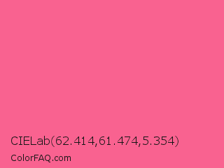 CIELab 62.414,61.474,5.354 Color is a light rose color and the nearest color is Light Crimson #f56991. Hex code #f96290 and RGB value is rgb(249,98,144). In RGB color space, this color is composed of 98% red, 38% green, 56% blue, In CMYK color space, this color is composed of 0% cyan, 61% magenta, 42% yellow , 2% black , In HSL color space, this color has a hue angle of 342° , 93% saturation and 68% lightness.