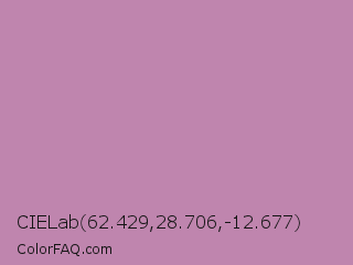 CIELab 62.429,28.706,-12.677 Color is a light magenta color and the nearest color is Opera Mauve #b784a7. Hex code #bf85ae and RGB value is rgb(191,133,174). In RGB color space, this color is composed of 75% red, 52% green, 68% blue, In CMYK color space, this color is composed of 0% cyan, 30% magenta, 9% yellow , 25% black , In HSL color space, this color has a hue angle of 318° , 31% saturation and 64% lightness.