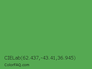 CIELab 62.437,-43.41,36.945 Color is a normal green color and the nearest color is Fruit Salad #4f9d5d. Hex code #55a952 and RGB value is rgb(85,169,82). In RGB color space, this color is composed of 33% red, 66% green, 32% blue, In CMYK color space, this color is composed of 50% cyan, 0% magenta, 51% yellow , 34% black , In HSL color space, this color has a hue angle of 118° , 35% saturation and 49% lightness.