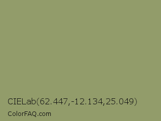 CIELab 62.447,-12.134,25.049 Color is a normal lime color and the nearest color is Artichoke #8f9779. Hex code #929c6a and RGB value is rgb(146,156,106). In RGB color space, this color is composed of 57% red, 61% green, 42% blue, In CMYK color space, this color is composed of 6% cyan, 0% magenta, 32% yellow , 39% black , In HSL color space, this color has a hue angle of 72° , 20% saturation and 51% lightness.
