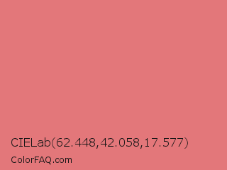 CIELab 62.448,42.058,17.577 Color is a light red color and the nearest color is Candy Pink #e4717a. Hex code #e3777a and RGB value is rgb(227,119,122). In RGB color space, this color is composed of 89% red, 47% green, 48% blue, In CMYK color space, this color is composed of 0% cyan, 48% magenta, 46% yellow , 11% black , In HSL color space, this color has a hue angle of 358° , 66% saturation and 68% lightness.