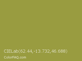 CIELab 62.44,-13.732,46.688 Color is a normal yellow color and the nearest color is Sycamore #908d39. Hex code #999c40 and RGB value is rgb(153,156,64). In RGB color space, this color is composed of 60% red, 61% green, 25% blue, In CMYK color space, this color is composed of 2% cyan, 0% magenta, 59% yellow , 39% black , In HSL color space, this color has a hue angle of 62° , 42% saturation and 43% lightness.