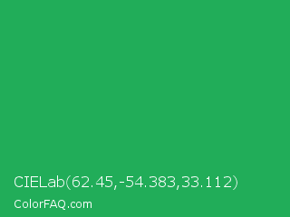 CIELab 62.45,-54.383,33.112 Color is a normal green color and the nearest color is Green Crayola #1cac78. Hex code #21ad59 and RGB value is rgb(33,173,89). In RGB color space, this color is composed of 13% red, 68% green, 35% blue, In CMYK color space, this color is composed of 81% cyan, 0% magenta, 49% yellow , 32% black , In HSL color space, this color has a hue angle of 144° , 68% saturation and 40% lightness.