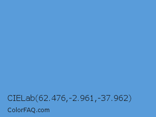 CIELab 62.476,-2.961,-37.962 Color is a normal blue color and the nearest color is Carolina Blue #56a0d3. Hex code #599cda and RGB value is rgb(89,156,218). In RGB color space, this color is composed of 35% red, 61% green, 85% blue, In CMYK color space, this color is composed of 59% cyan, 28% magenta, 0% yellow , 15% black , In HSL color space, this color has a hue angle of 209° , 64% saturation and 60% lightness.